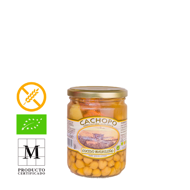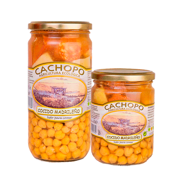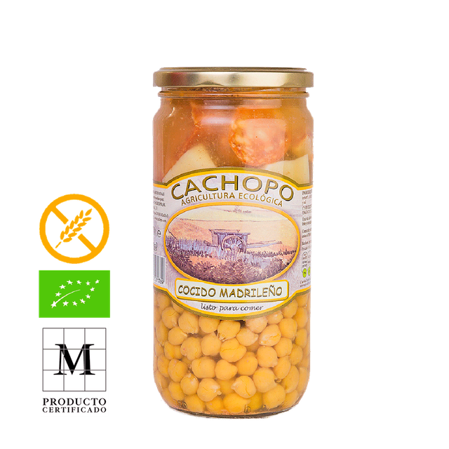 Cocido Madrileño Ecológico Tipica receta madrileña que completa nuestra variedad de comidas preparadas. Elaborado con nuestros suaves y tiernos garbanzos, ésta es nuestra primera conserva con carne y embutido de gran calidad.