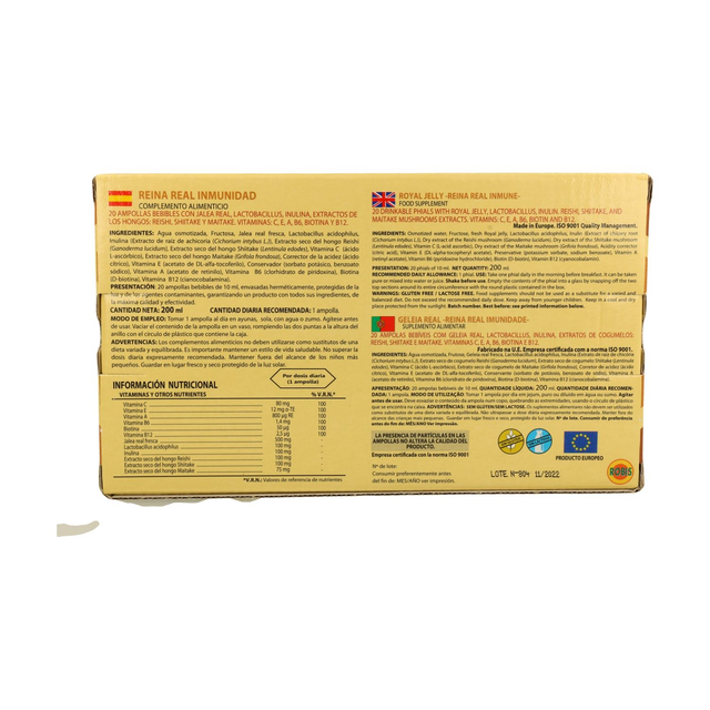 Agua osmotizada, Fructosa, Jalea real fresca, Lactobacillus acidophilus, Inulina , Extracto seco del hongo Reishi , Extracto seco del hongo Shiitake , Vitamina C , Extracto seco del hongo Maitake, corrector de la acidez (ácido cítrico), Vitamina E , Vitamina A , Vitamina B6 , Biotina y Vitamina B12 .